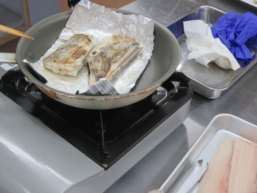 その後の調理実習では、1台のコンロを使用し、各自が塩焼きと天ぷらを調理。